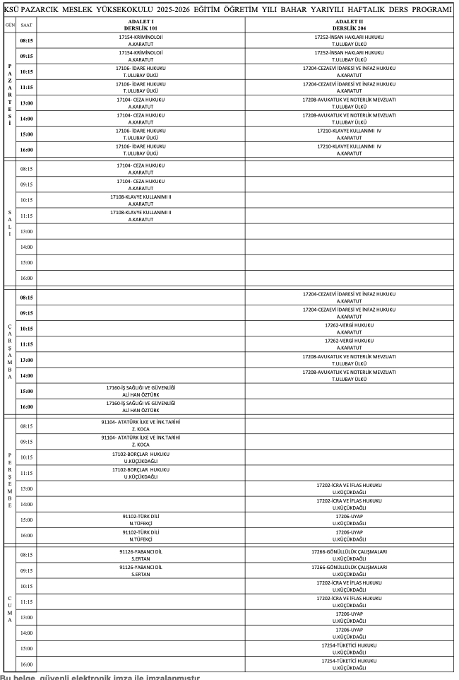 Adalet Programı Bahar Dönemi Ders Programı