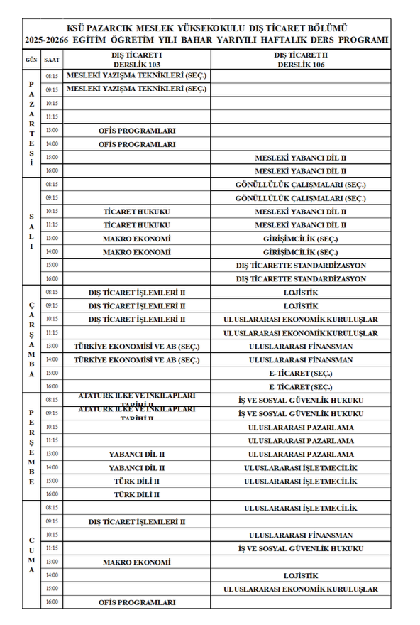 Dış Ticaret Programı Bahar Dönemi Ders Programı