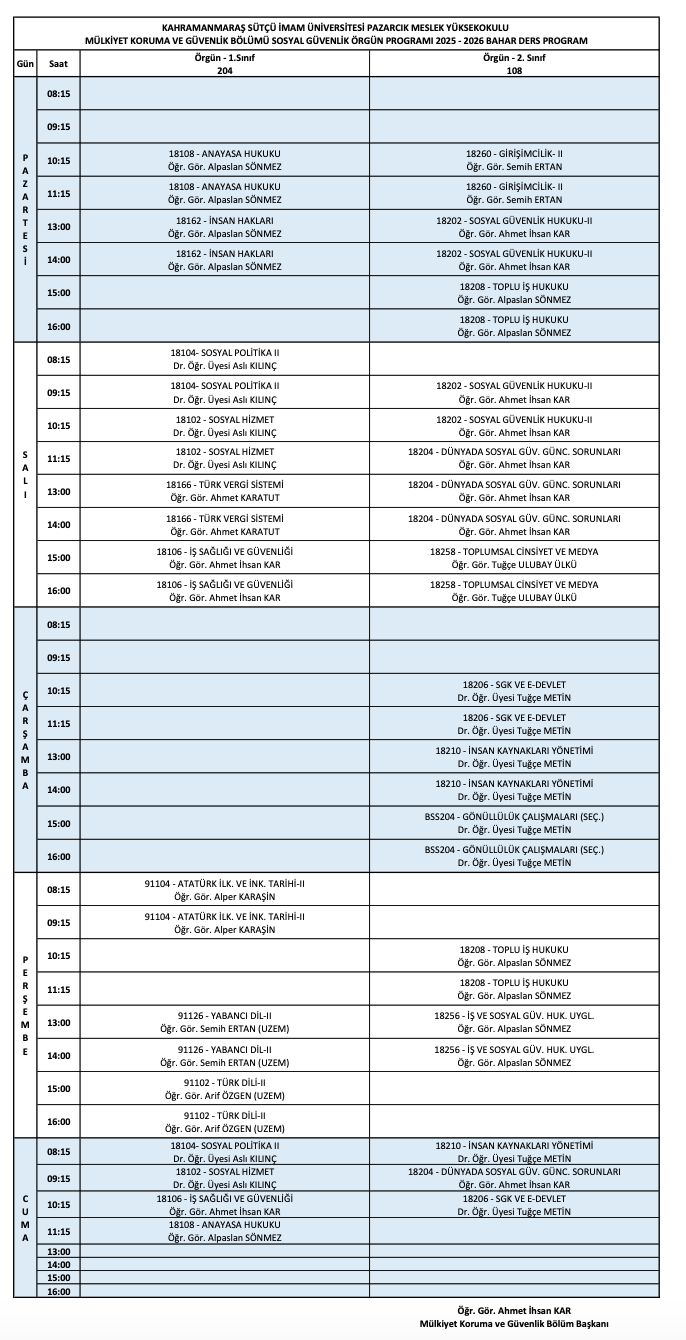 Bölümlerimizin 2025-2026 Bahar Dönemi haftalık ders programları şu şekildedir;