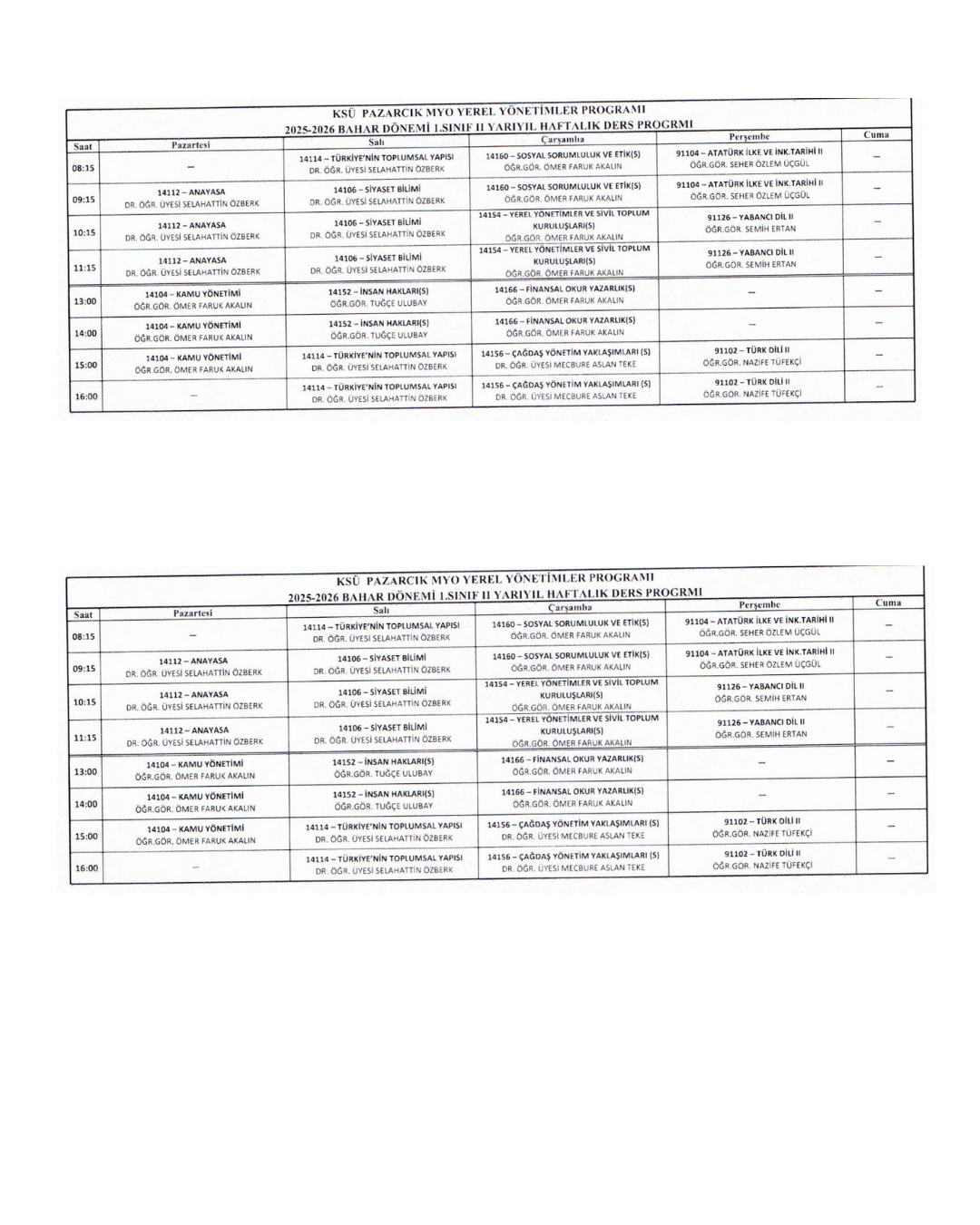 2025-2025 Bahar Dönemi Haftalık Ders Programları