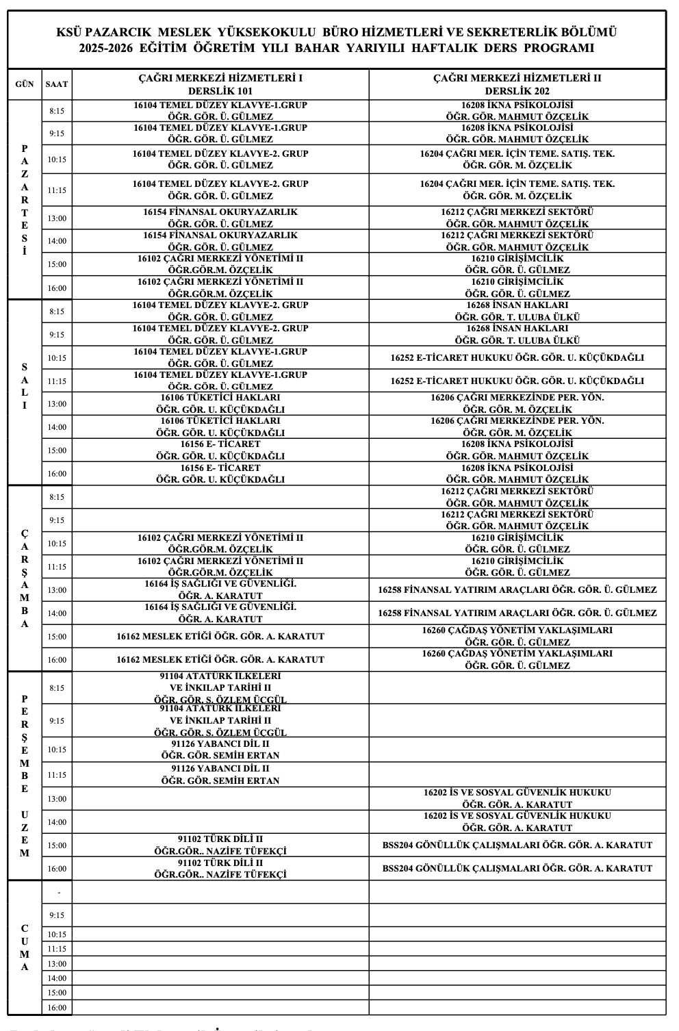 Çağrı Merkezi Hizmetleri Bahar Dönemi Ders Programı