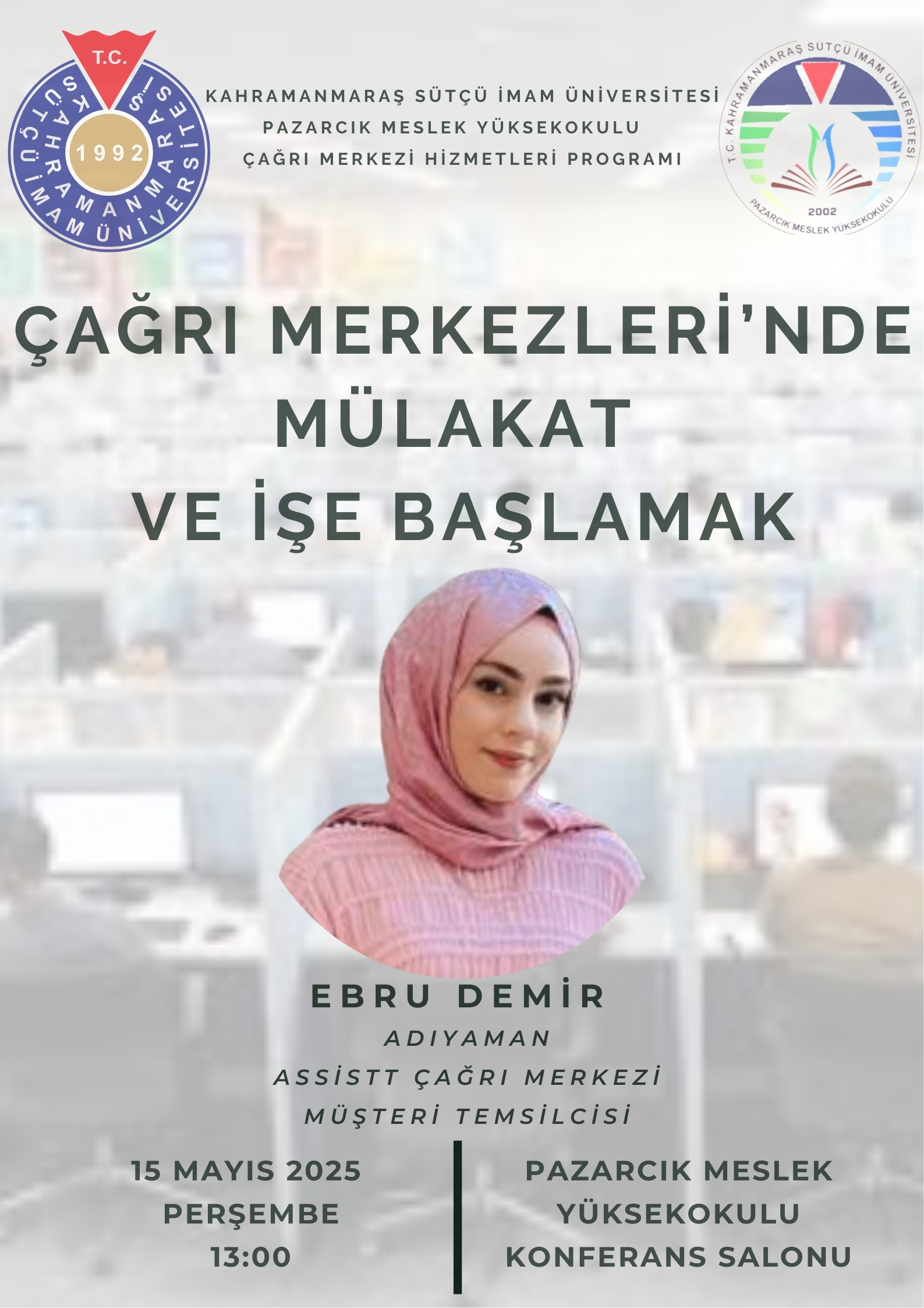 15 Mayıs 2025 Perşembe günü saat 13:00'de Pazarcık Meslek Yüksekokulu Konferans Salonunda,
